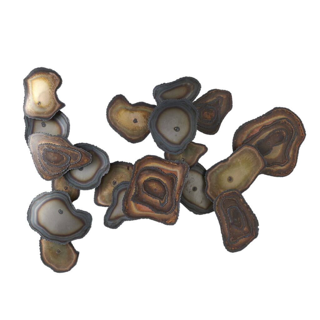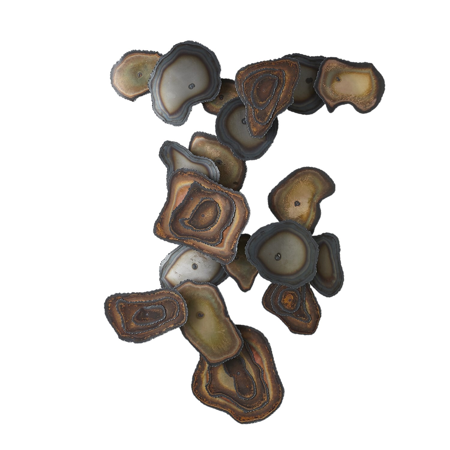[0] => Wrought from cut iron and brass, the Mod Terrace Wall Art features textural braised edges and a flamed patina, plus a protective coating of matte lacquer. Rounded metal shapes are layered in a three-dimensional, organic arrangement that evokes the strata of rock formations, the interiors of geodes, or even the rings of trees. Hanging holes on the back allow you to mount this wall sculpture vertically or horizontally, and no two pieces are exactly alike.