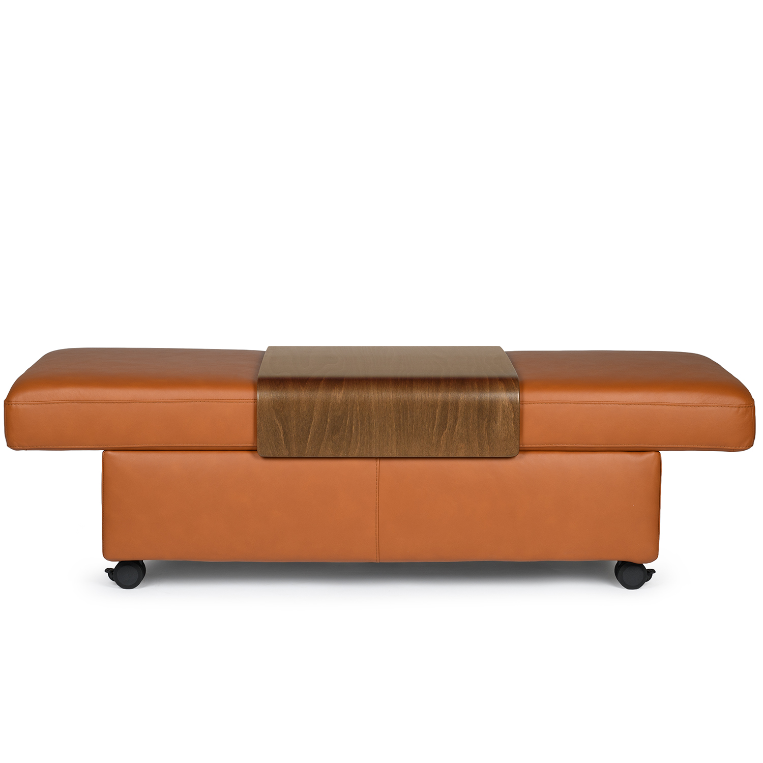 The Stressless® Double Ottoman and Table features soft New Cognac Paloma leather, wheels for mobility, and a sleek fitted table in walnut, providing you with even more room to relax. The versatility of this ottoman means that it can both hold your drink and increase your comfort in the seated or reclined position by ensuring the proper alignment of the legs and feet.
