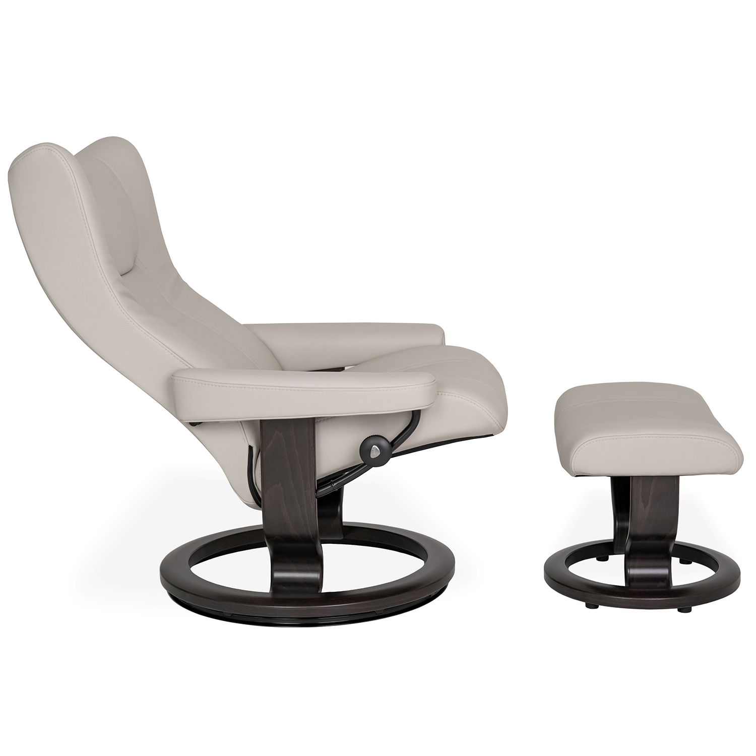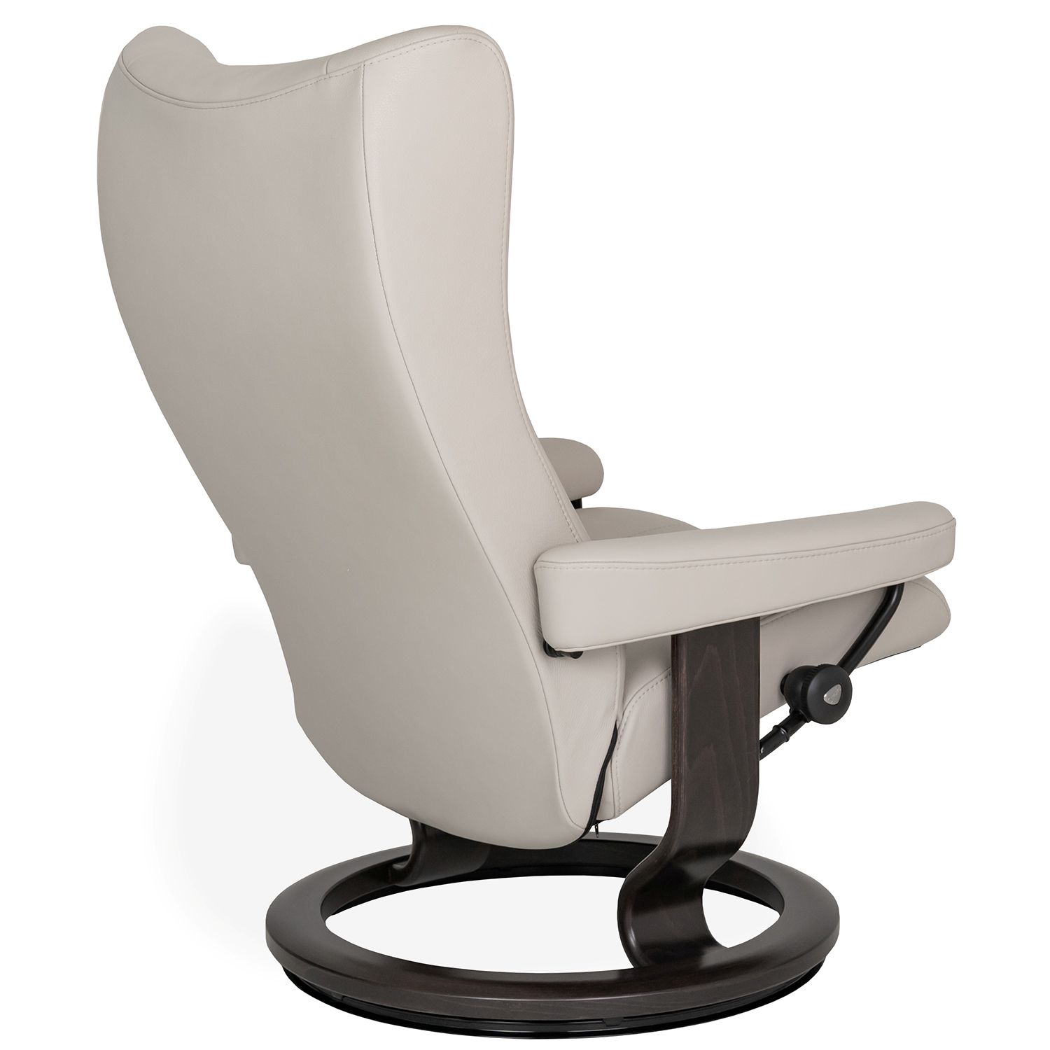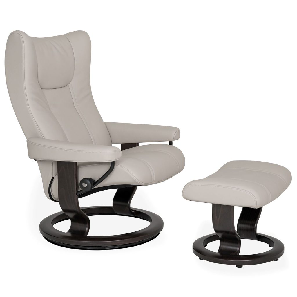 The Wing Medium Chair and Ottoman by Ekornes of Norway is one of the first and most popular Stressless® designs, dating back to 1994. Available with a wenge Classic base and light grey Velaro leather upholstery, this chair has a smoothly curving "winged" headrest and matching stitching that creates crisp lines in the leather. Wing's timeless design is paired with cutting-edge Stressless® comfort technology within the chair, including the patented Plus™ and Glide systems. These ergonomic mechanisms allow the chair to provide continuous support for the head and lower back, while also adjusting the reclining angle based on shifts of the body.