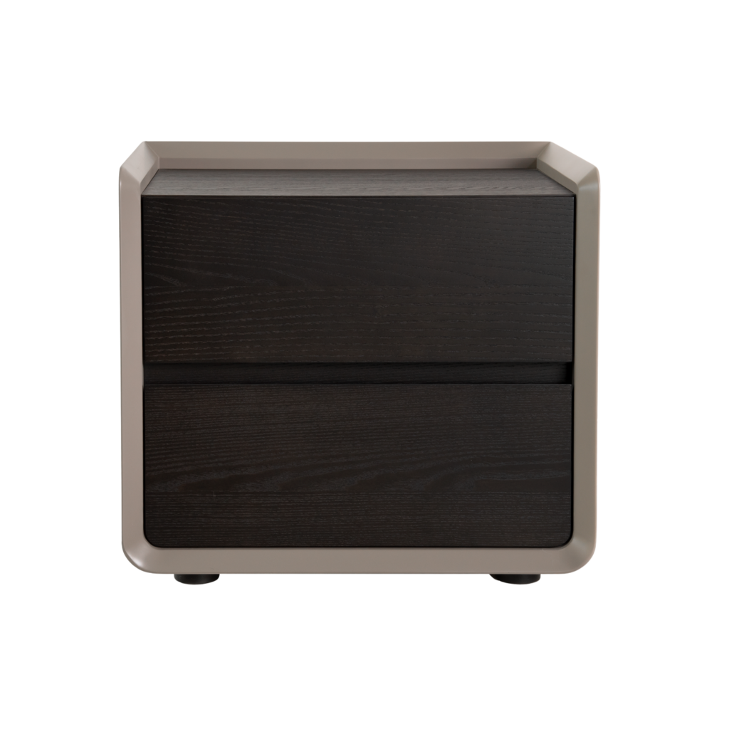 [0] => The Wyatt Nightstand brings sleek, minimalist style to your bedroom. The smooth grey matte frame wraps around the dark ash drawers, creating a raised edge and highlighting the contrasting textures. Rounded corners soften the look and two drawers provide ample storage space. With its neutral, dark color and clean lines, Wyatt can complement a wide variety of upholstered or wood-finished beds.