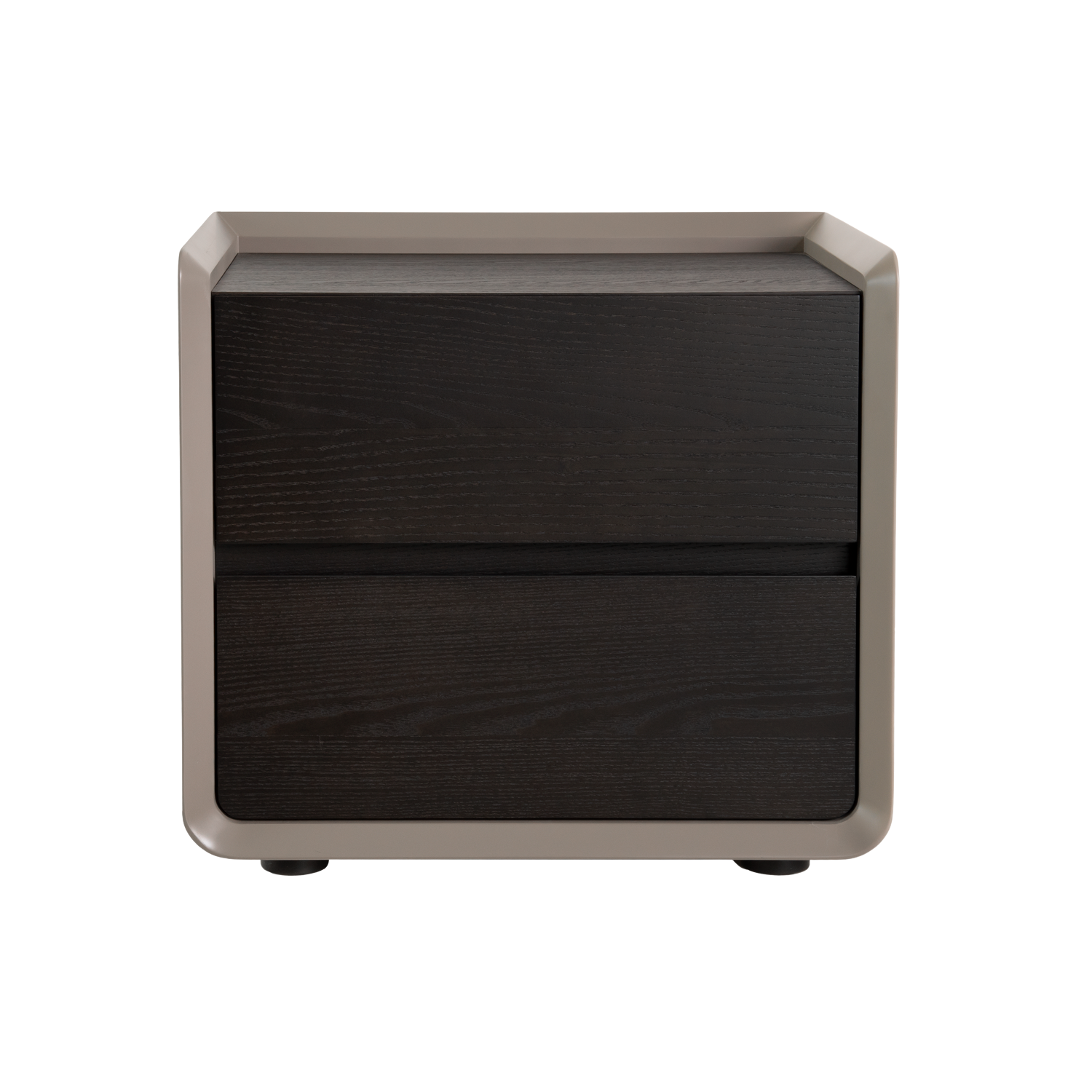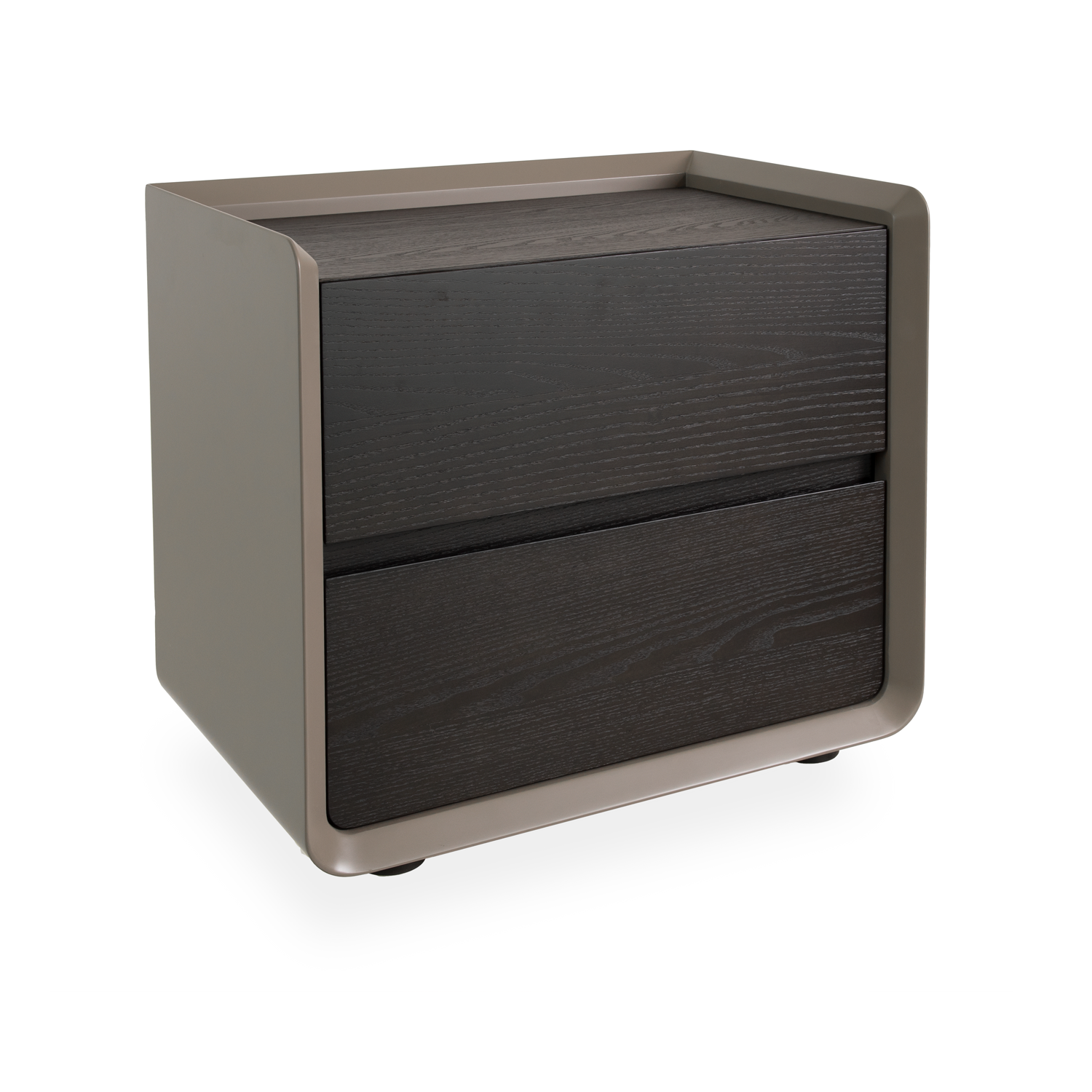 The Wyatt Nightstand brings sleek, minimalist style to your bedroom. The smooth grey matte frame wraps around the dark ash drawers, creating a raised edge and highlighting the contrasting textures. Rounded corners soften the look and two drawers provide ample storage space. With its neutral, dark color and clean lines, Wyatt can complement a wide variety of upholstered or wood-finished beds.