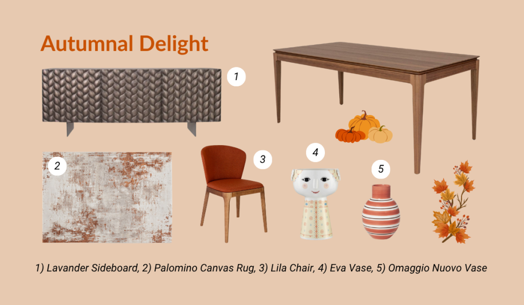 With its pleasing walnut veneer, the Everett Table fits seamlessly into fall color palettes. Rich shades of brown, orange, and yellow form the anchor for an Autumnal Delight aesthetic, with cozy fabrics and natural textures adding tactile indulgence. We love the Lila Dining Chair in rust fabric with a winged backrest, as well as the beautifully patterned front of the Lavander Sideboard. Deck your table with a centerpiece of leaves and gourds, or flowers in a vase like Omaggio Nuovo, to capture the essence of fall.