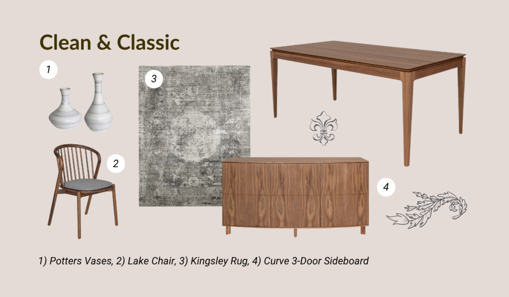 Embrace the beauty of basics with this simple yet welcoming aesthetic that will make guests feel instantly at home. Think warm wood and soft curves, with accessories that lean toward a more traditional or minimalist style. The Lake Dining Chair is a prime choice for this look, with its slatted back and fabric cushion. Add a sideboard like the Curve, whose rounded front echoes the lines of the Lake Chair, and try neutral vases like the Potters or an elegant rug like the Kingsley for finishing touches.