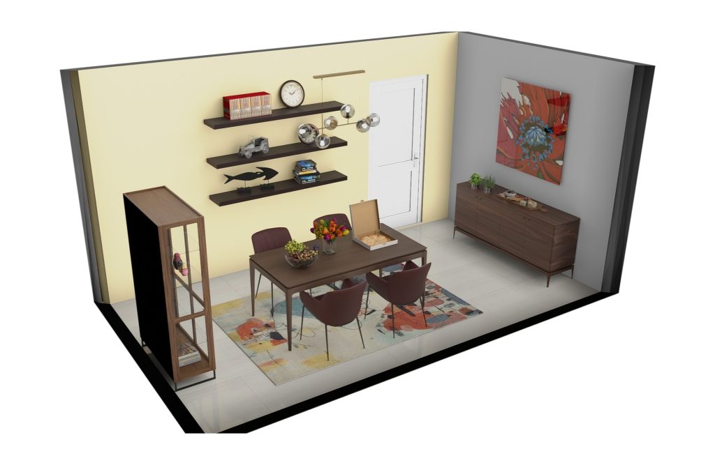 Express your personality and add a pop of energy to your dining room with a Colorful & Curated theme. Try dining chairs in a bold hue like the Anita in plum leather, with a unique rug like Colorworks to add artistry to your floor. Accessorize with your favorite wall paintings, vases, or figurines to create a space that reflects your unique taste. A curio cabinet with interior lighting like Nils is ideal for storing and displaying both dinnerware and art objects.
