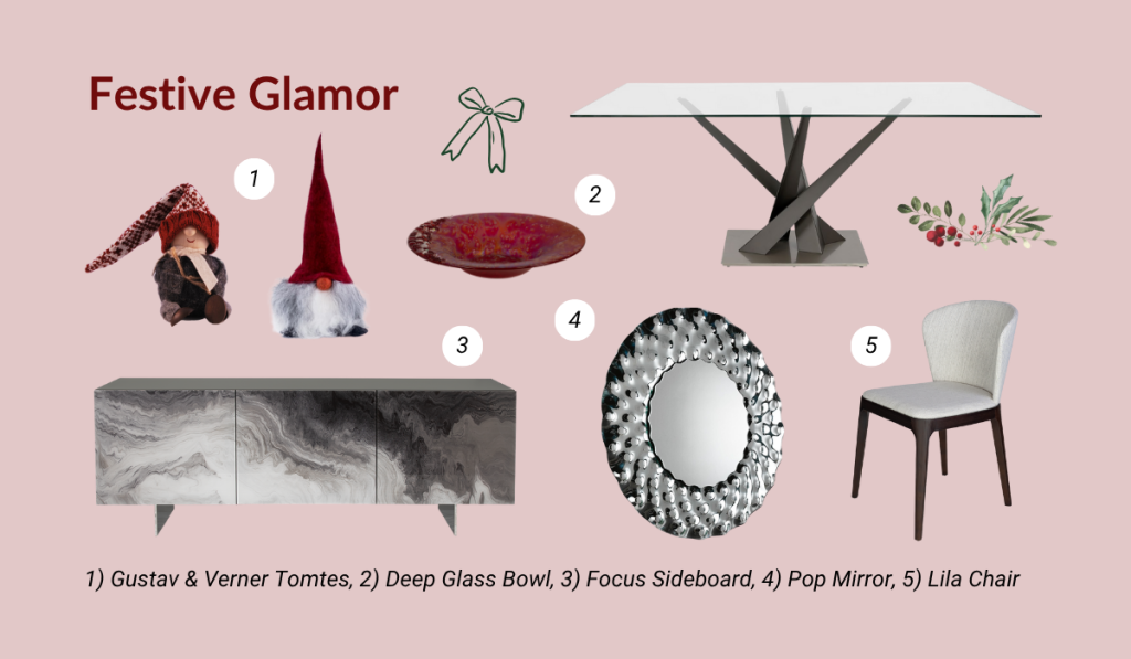 Get into the holiday spirit with a dining room aesthetic that is equal parts festive and refined. Cool to the touch, the glass and metal of the Crystal Table channel wintry vibes, while the shape of the base is reminiscent of icicles. It pairs well with the Focus Sideboard in stunning printed glass, or the Pop Mirror with its dazzling frame. Balance out the look with holiday decor that adds a pop of whimsy and charm, like the woolen tomte figures.