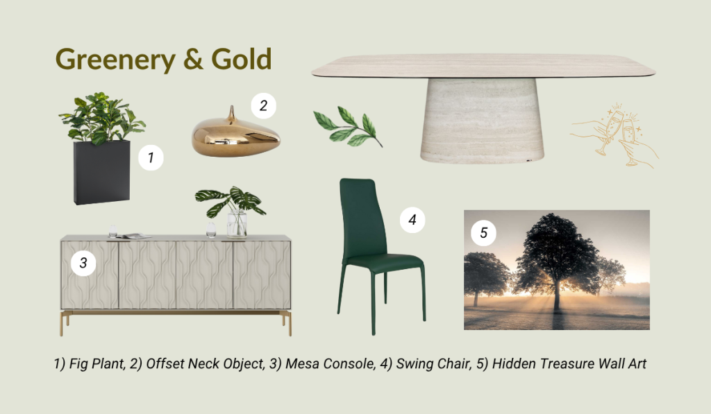 Bring your dining space to life with an aesthetic rooted in the restorative beauty of plant life, amplified with the shimmer of gold finishes. Whether you incorporate houseplants and potted herbs, or opt for faux greenery, a biophilic emphasis gives your space a breath of fresh air. Consider dining chairs in matching green, like the Swing, and add sophistication with the sinuous pattern and brushed brass of the Mesa Console. Decor like the Hidden Treasure Wall Art and the Offset Neck Object bring the warmth and shine of sunlight to the room.