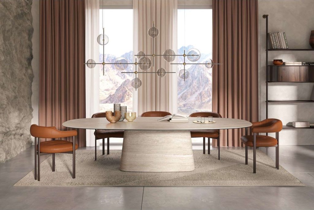 Evoke the splendor of a getaway in the Italian countryside – without leaving your house. It’s all about a curated blend of luxurious materials, striking silhouettes, and a color palette rooted in warm neutrals. The Napoleon Table pairs perfectly with the Amsterdam Sideboard, clad in matching ceramic marble with contrasting grey panels. Dine and relax in the Greta Chairs, upholstered in brown fabric, and make the room feel extra spacious with a large mirror like the Cosmos in bronze glass. For an extra touch of romance, hang a chandelier or pendant light over the table.