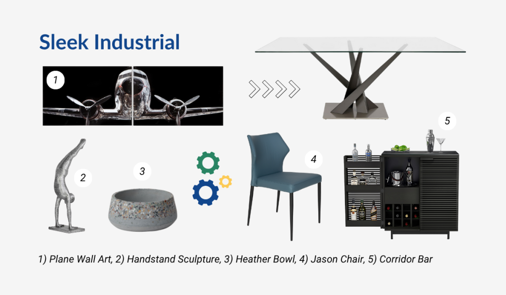 Bold and cosmopolitan, an industrial aesthetic creates a commanding presence in your dining room. It features a mostly monochromatic color palette and materials like metal, glass, and stone. Decorate with industrial imagery like the Plane Wall Art and try adding softer and more colorful accents like the Jason Chair in blue leather to keep the mood from feeling too stark. A functional bar like the Corridor lets you mix cocktails while admiring the city view.