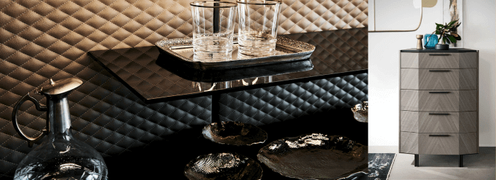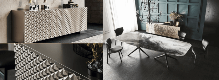 Atlantis Crystalart Table by Cattelan pictured above, has a marble-look but is constructed from art glass with an artistic print applied to the underside – a stunning impression without the maintenance of natural stone. The striking Royalton sideboard with 3-D geometric shaping ensures that Italian design still has an aura of glamour. These little unexpected touches of texture and sculptural design will become the focal points of your living or office space.