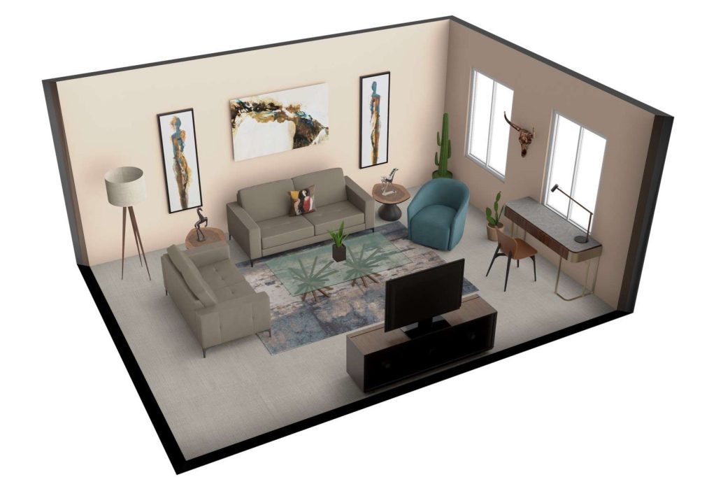 Try anchoring this aesthetic with a brown or taupe seating collection – its versatile color easily allows you to switch up your design theme for different times of the year. Or, go bold and experiment with core pieces that blend materials and textures, balancing modern elegance with warm desert vibes. Pay attention to smaller pieces and accessories too, which allow you to bring in complementary colors, patterns, and motifs – like cacti or horses – that further set the scene. Include some potted succulents to complete the look.