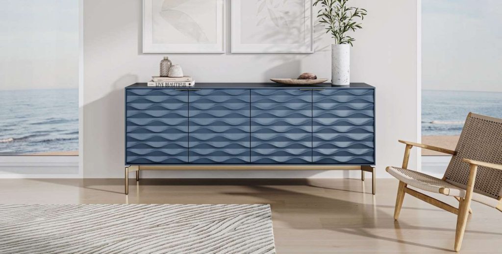 Anchor your space with a sofa or sectional in blue or white, then layer on accent seating that invites you to lounge. Accessorize by introducing your favorite ocean-themed patterns, forms, and imagery. Wall artworks and vases are an easy addition to make, while choosing case goods or rugs with more subtle oceanic cues can allow them to blend into a wider variety of themes.