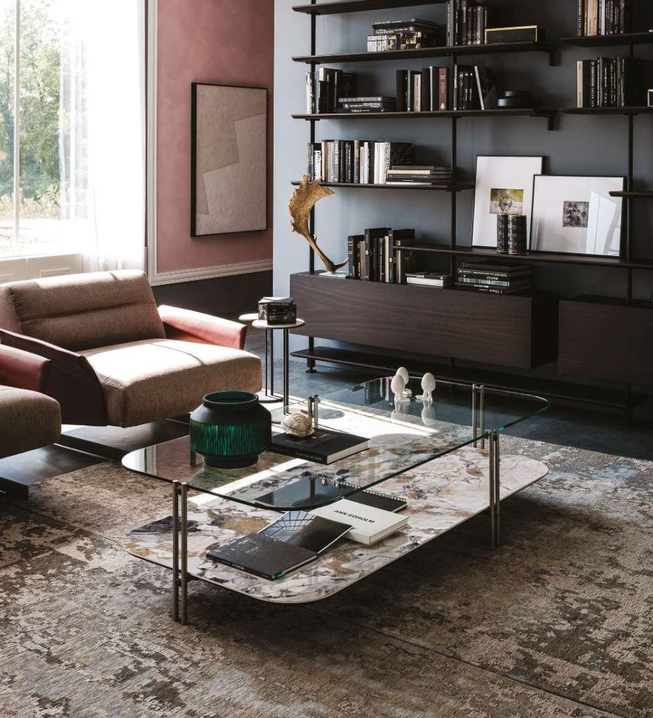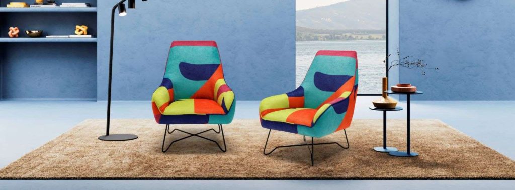 Brantley is a particular fan of Italian manufacturer Egoitaliano for their unique upholstery options. Their sofas, chairs, and sectionals can be special-ordered in a wide array of patterned fabrics, like the multicolored Frenzy fabric of the Namy, or the orange and burgundy Grimaldi fabric of the Ludo.