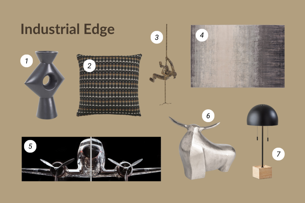 Combining urban and rustic elements with modern functionality, Industrial Edge is for those seeking a balanced blend of organic textures and sophisticated style. Raw, natural materials like metal, wood, and stone are essential for this aesthetic, bringing in a starker feel with all the benefits of contemporary design; think an eye-catching wall sculpture with a thick-hewn wood panel or a steel sculpture with a textured look but smooth feel.