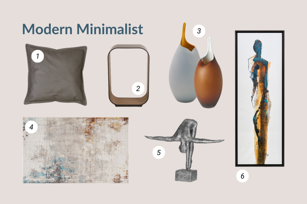 If you prefer a simple, uncluttered look, a function-focused aesthetic like Modern Minimalist can keep your space feeling intentional while adding visual interest. Establish a base palette of neutral tones by incorporating natural materials like wood and leather, then add subtle pops of color with a wall art or rug. Browns, blues, and mustards work especially well to infuse color in an understated way.