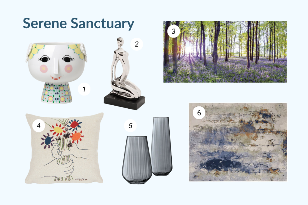Focus on a soft color palette with a mix of pastel and organic tones. Mixing light blue, sage green, and lavender with white and grey staples will establish a soothing ambiance; adding small touches of primary tones will keep your space from feeling monotonous. Create a light, airy feel with a variety of physical and visual organic elements interspersed with soft or cozy textures that invite you to sink in.