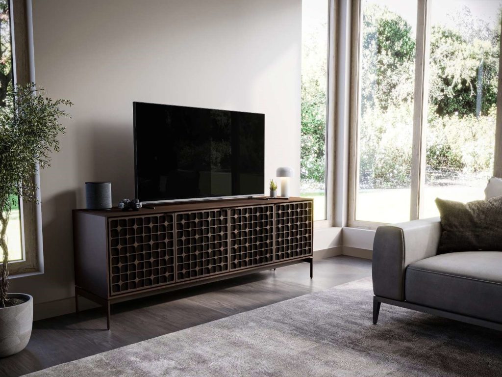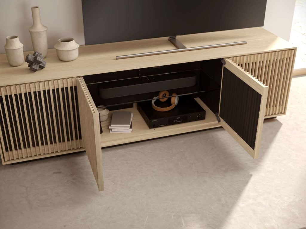Whether you have young children and pets at home, live in an earthquake-prone area, or simply want extra stability in your media setup, it’s a good idea to anchor your TV to your TV stand or to the wall behind it. Some manufacturers, like BDI, will go above and beyond and include anchor straps with the purchase of TV stands and media furniture. For instance, the BDI Elements Console, with its striking constellation pattern, and the BDI Corridor TV Stand, with its sleek louvered front, are two great examples of pieces that are both stylish and safety-conscious.