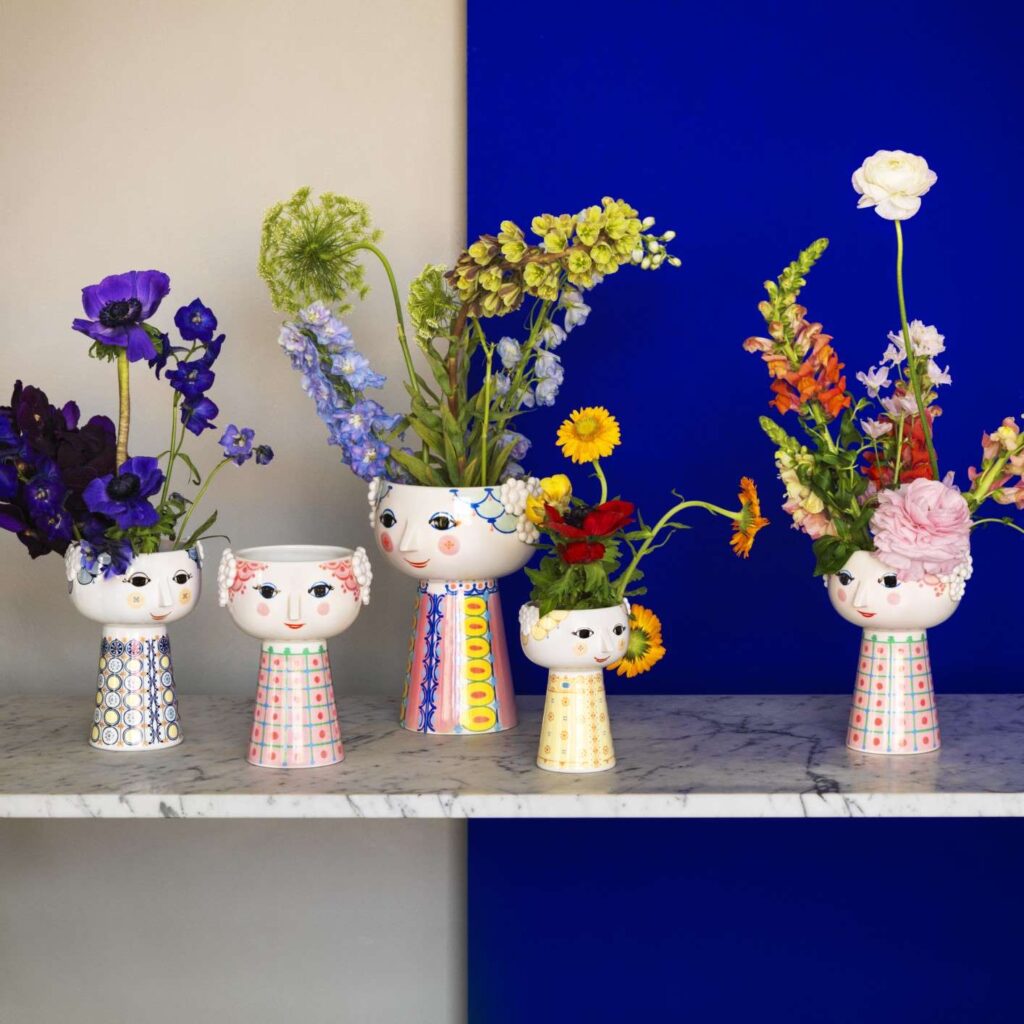 An icon of Danish design, Bjørn Wiinblad was born in 1918 and apprenticed in typography before pursuing his dream of becoming an artist. In 1943, he began exploring ceramics – decorating dishes, bowls, and other items with bright patterns and drawings of smiling women. Wiinblad’s Eva series, reimagined by Rosendahl of Denmark, brings back illustrations from his best-known work, featuring pots, vases, and candleholders with the design of a smiling woman in a patterned dress.