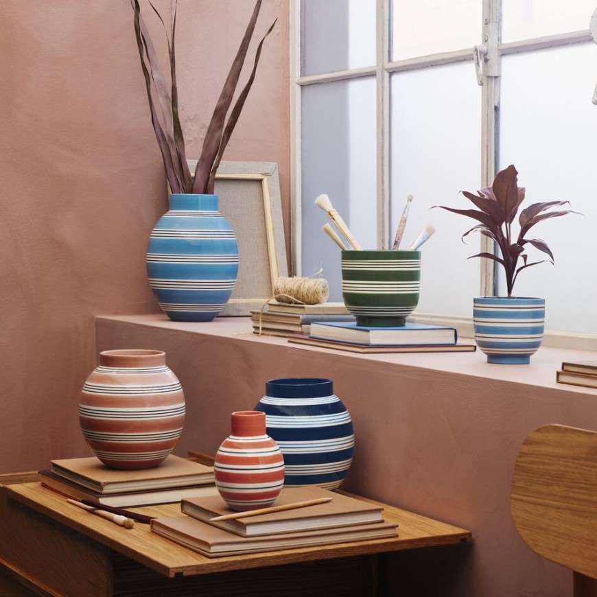 With minimalist patterning that alternates between wide and narrow stripes, plus a range of cheerful colors from Blue to Green to Terracotta, the Omaggio Nuovo pieces will harmonize with virtually any interior. Try using these vases to show off flowers and houseplants, use them as fun storage for supplies and utensils, or display them on their own to let their simple beauty brighten up a room.