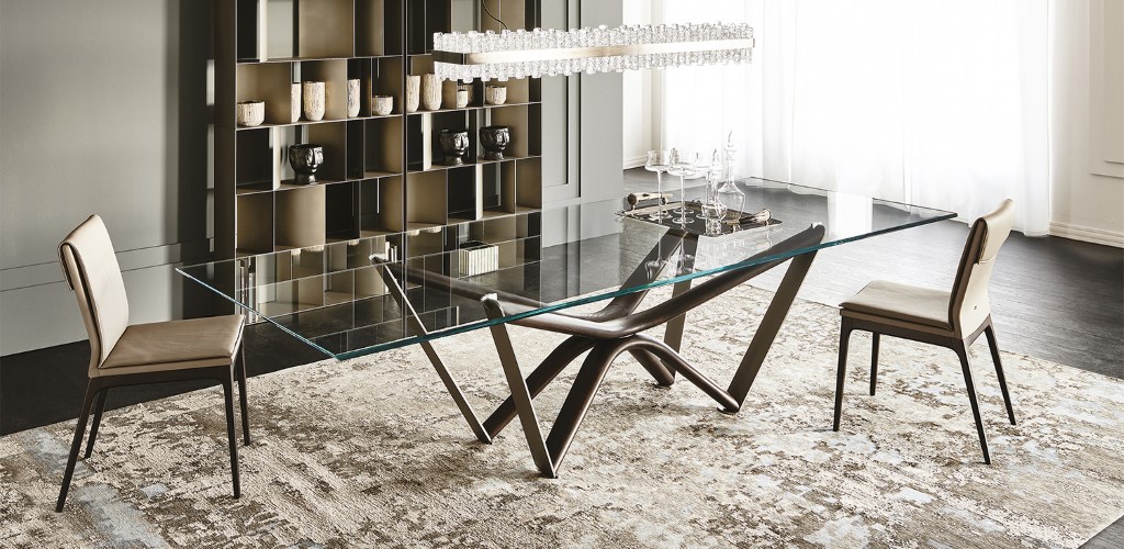 Check out the innovative design of the Soho Ker-Wood dining table. Or consider the Marathon dining table, by Cattelan Italia, which combines tradition with contemporary design. The clear glass tabletop features beveled edges and is paired with a burned, oak-stained ashwood base in a sloped shape, for a sculptural, elegant look.
