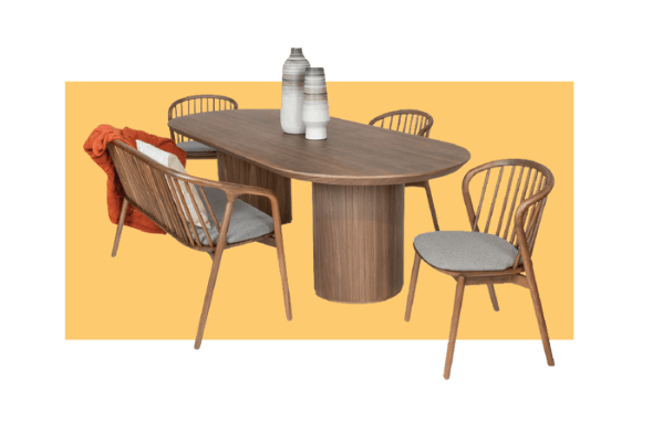 Shape is an essential component of design along with color. Looking at the shape of the table’s base or frame can help to coordinate the chair. For a table with a rounded or curved frame, a complementary chair can be one whose backrest or leg shape is related. For example, the curve of the Essex Table resonates with the shaped backs of the Lake Chair and Bench. As a bonus, the slats of the Lake pieces echo the slatted etching on the legs of the Essex.