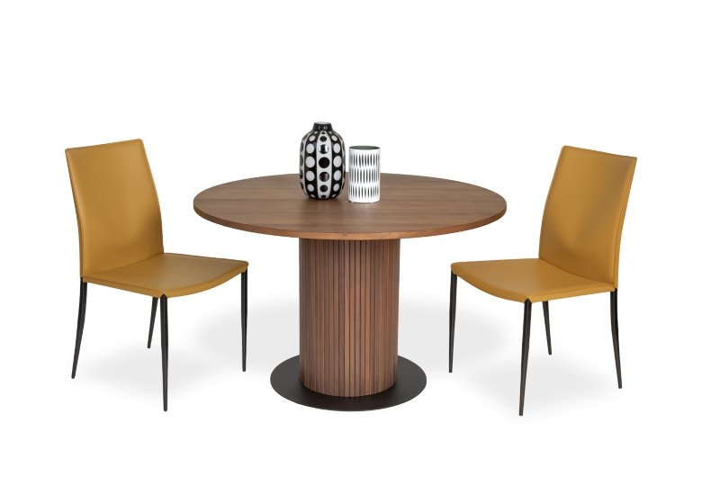 Indeed, color can be a crucial player in your dining setup. Consider chairs that match the color temperature (warmer or cooler) of your table, whether from matching wood, such as walnut with walnut, or carefully choosing an upholstery shade. Again, notice how the sunny mustard yellow of the Morris further brings out the warm wood tones of the Wave.