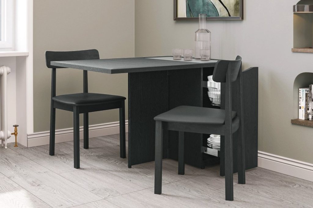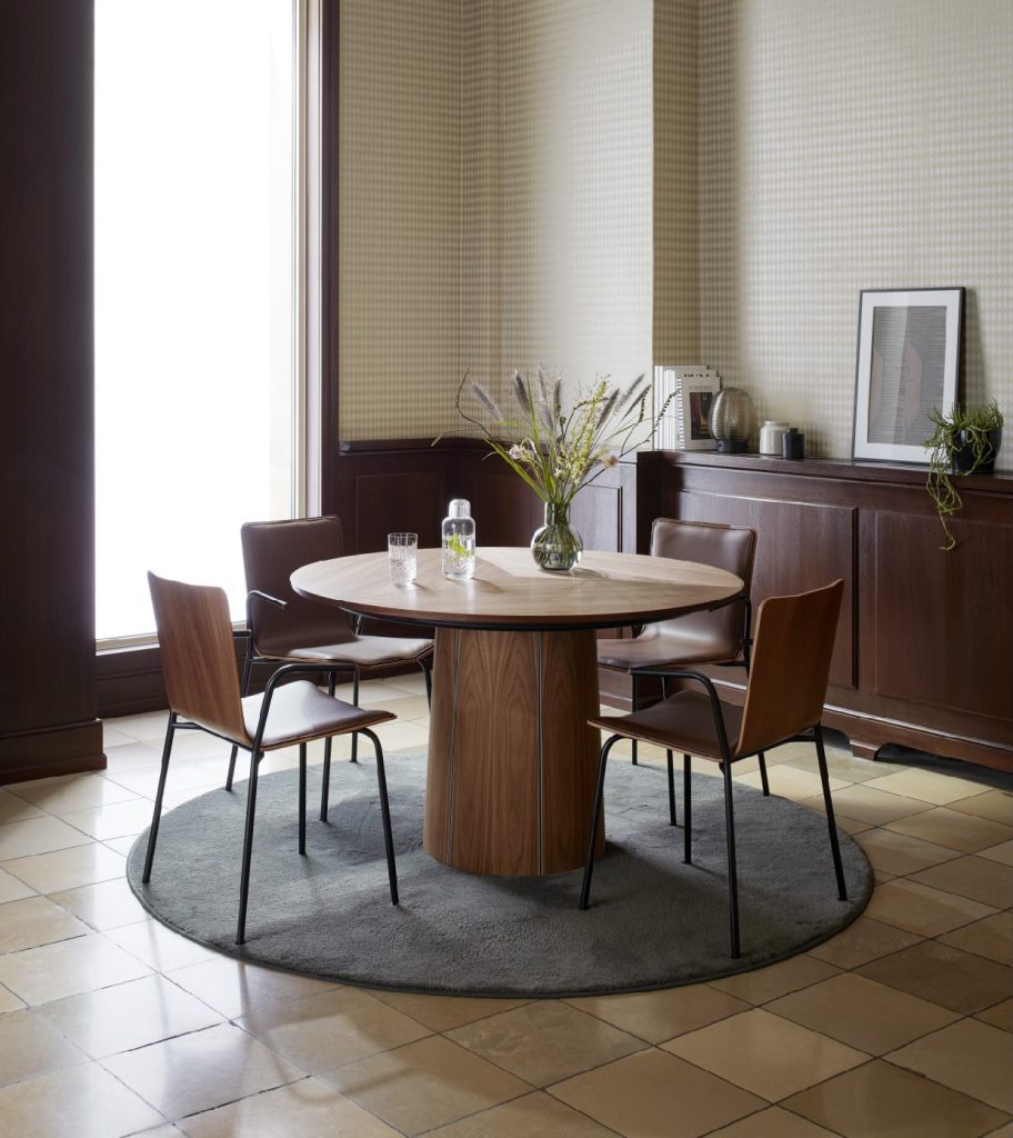 Copenhagen’s Bella Clara Dining Table, for example, extends from 77” to 98” with a self-storing extension leaf whose textured walnut surface creates a striking contrast to the high-gloss grey lacquer on the rest of the tabletop. Rectangular extendable tables like Bella Clara work well in most spaces because of their ability to adapt to an assortment of gatherings. However, round tables are worth considering if your goal is to encourage more conversation and create a cozier ambiance. For example, the Jones Dining Table has a smaller circular tabletop and features an innovative spring mechanism that quickly unfolds leaves concealed in the base, creating seating space for additional guests as well as ample leg room.