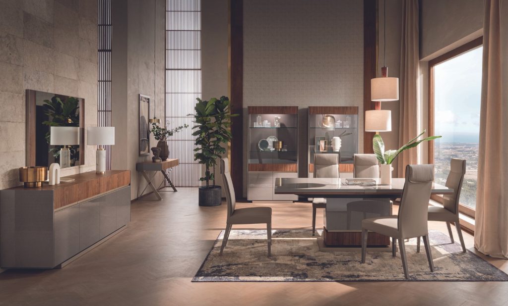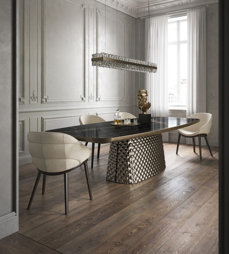 For homes that prefer a more traditional look, dining tables with pedestal, trestle, or simple four-legged bases are a perfect choice due to their sturdiness and lasting charm. With its classic trestle base, the Heidi Dining Table has a no-fuss look that is nonetheless timeless. If you prefer something more contemporary, bases that use artistic, industrial, or sculptural elements will likely capture your interest. These will tend to stand out, whether it’s the distinctive lines of the Gea‘s origami-inspired base, the breathtaking craftmanship of the Atrium in quilted glass, or the crisp, hourglass-like shape of the Clessidra in walnut and ceramic.