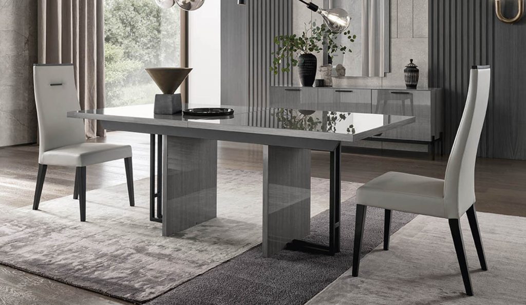 For a dining space that isn’t afraid to embrace a bold, contemporary look, the Bella Centro Dining Table sports high-gloss grey veneer with a visually striking geometric base. We especially recommend this table for a semi-formal to formal dining space because of its elegant presentation.