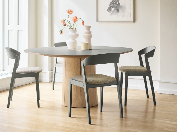 Copenhagen’s Bella Clara Dining Table, for example, extends from 77” to 98” with a self-storing extension leaf whose textured walnut surface creates a striking contrast to the high-gloss grey lacquer on the rest of the tabletop. Rectangular extendable tables like Bella Clara work well in most spaces because of their ability to adapt to an assortment of gatherings. However, round tables are worth considering if your goal is to encourage more conversation and create a cozier ambiance. For example, the Jones Dining Table has a smaller circular tabletop and features an innovative spring mechanism that quickly unfolds leaves concealed in the base, creating seating space for additional guests as well as ample leg room.