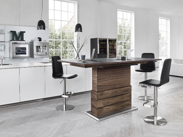 For example, the Karsten High-Rise Dining Table features an electric adjustment mechanism that allows you to raise its height from 25” to 43”, creating one surface for a variety of activities. A true multi-tasker, Karsten also comes with extension leaves that let it accommodate not only a large gathering, but also a sizable amount of paperwork, or an ambitious craft project. Being able to raise or lower the table allows it to function at bar or counter height for dining but also act as a tall buffet in a party situation or even as a sit/stand desk for work or creative activities.