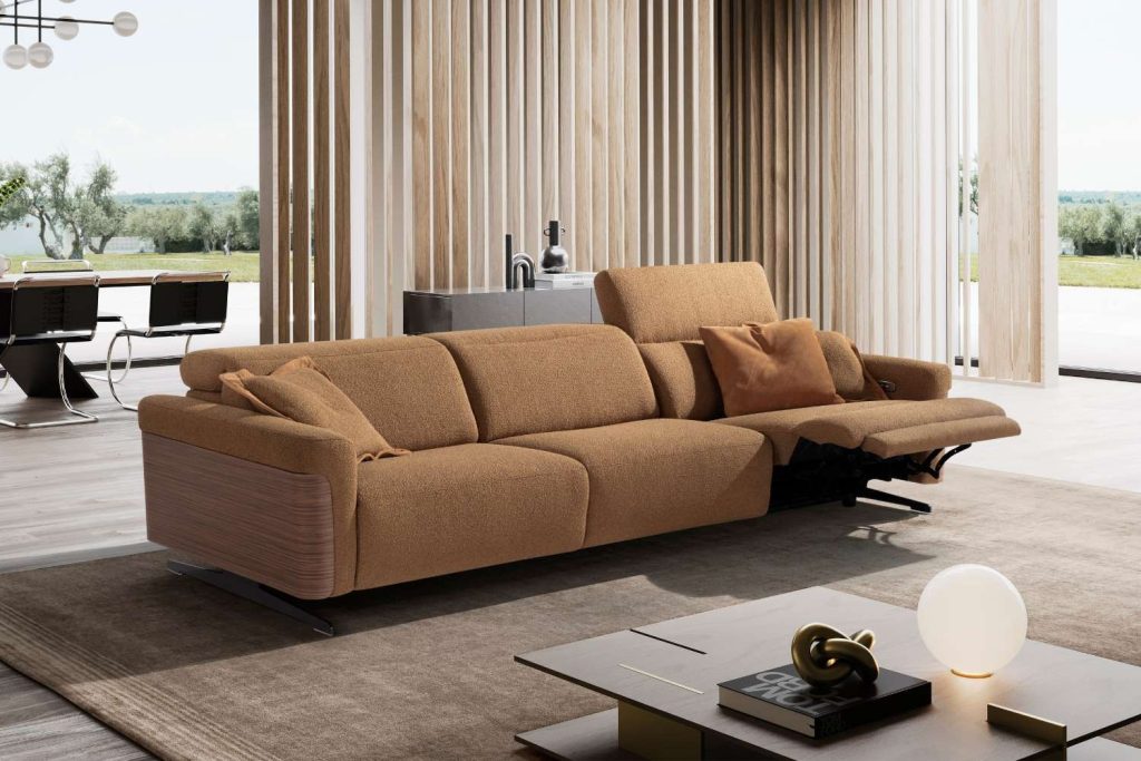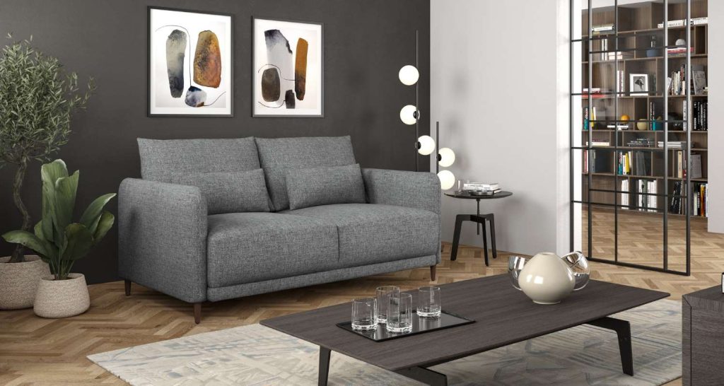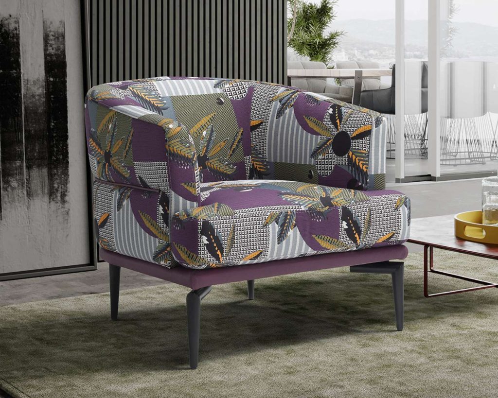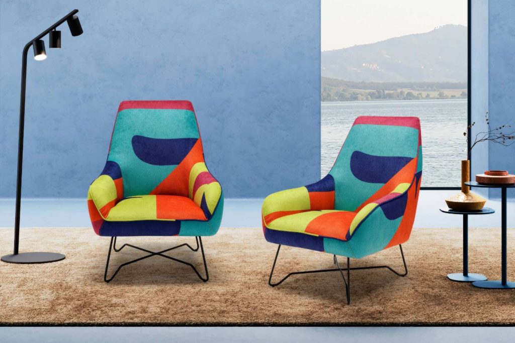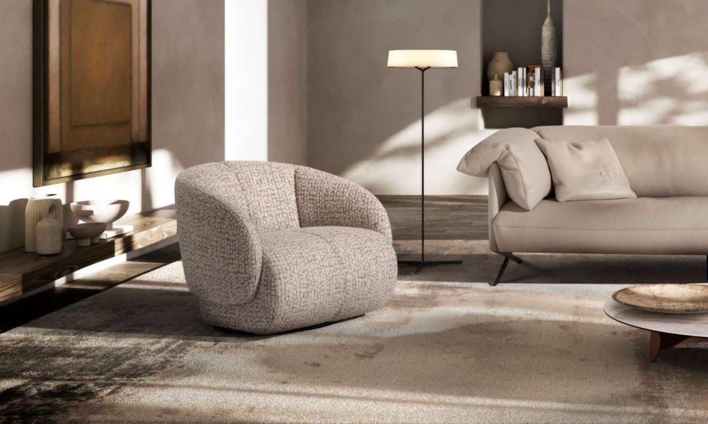 There are no fewer fabric options when it comes to pattern and color, especially as Copenhagen offers special orders for many of the brands we carry. “Ego Italiano has many different fabric options in various colors and patterns that customers can special order on any piece in their collection, like the Frenzy fabric you’ll find on our Namy armchair,” explains Mielnik. Indeed, a living room chair is an ideal furnishing to order in fabric; Mielnik suggests adding a statement piece or two with a “bold printed pattern or fun texture to contrast with your overall design intentions, allowing your chosen pieces to stand out.” Namy’s dynamic look certainly fits the bill, as well as the Bonnie armchair’s tropical Kapua fabric – both chairs naturally energize the room. For a more grounded look, consider a fabric piece that balances a nice texture with a monochromatic color scheme. The Gaia sectional features a blue-grey cashmere microfiber fabric that’s soft but refined, perfect for a more metropolitan living space, while the Arlo swivel chair’s polyester Balloon fabric combines buoyant support and subtle playfulness for a retro-inspired feel.