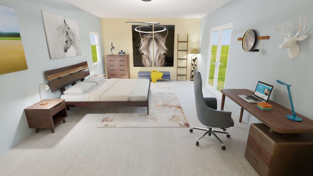 For a horse lover’s interior, Navarro recommends “starting with black or brown as the main color, then accentuating with complementary hues.” Brown is an especially versatile color that comes in a range of tints and shades, from the deep chocolate brown of the Rover Armchair to the warm cognac of the Jayden Sectional, to the light walnut of the Frank Desk.