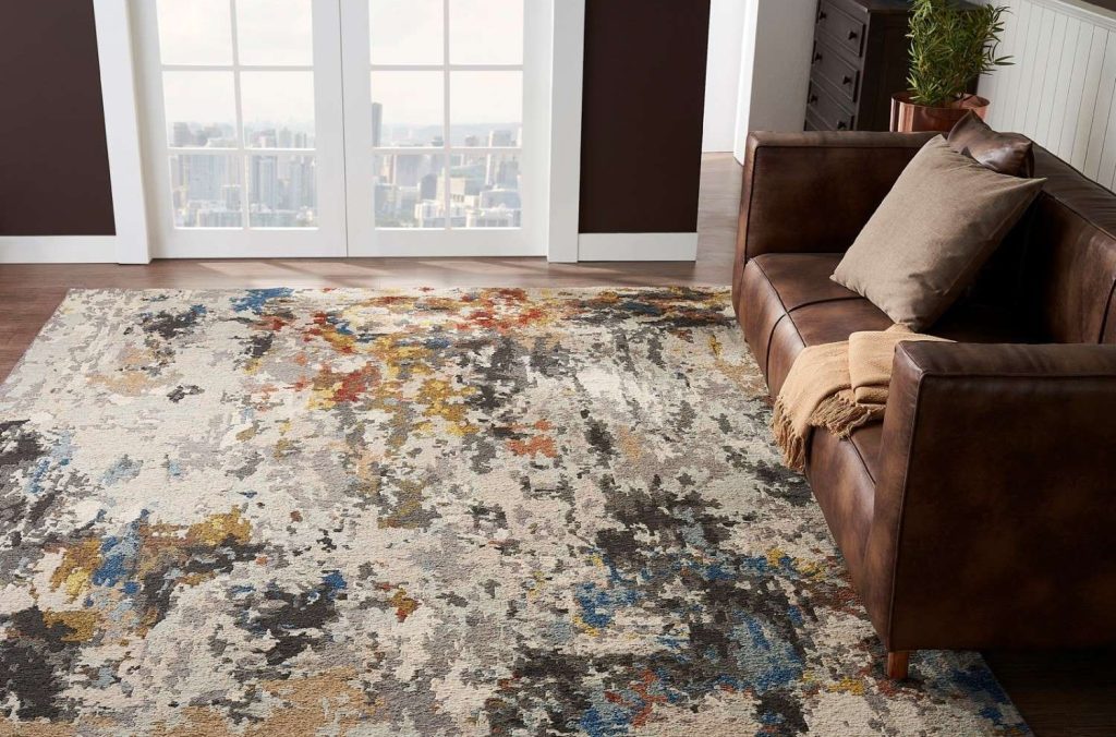 Accent colors can include whites and beiges; earthy reds, oranges, and yellows; or greens and blues that evoke rolling pastures and clear skies. The Simone Rug is one example of a piece that blends green, brown, yellow, blue, and grey tones in a variegated pattern.