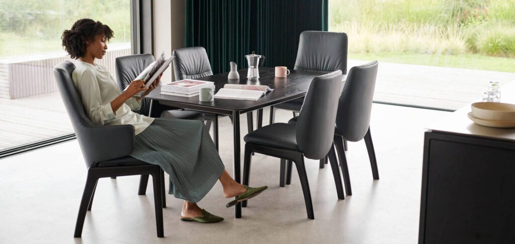 Choose furniture made from natural, solid wood – preferably lighter, unstained wood. Pair wood furniture with wool rugs, handmade ceramics, linen and cotton fabrics, or leather. Materials with texture bring warmth to your home. The Lea Dining Table, made in Denmark, is crafted from rich oiled walnut. Its modern sculptural base contrasts nicely with the solidity of the tabletop, giving it a balanced, natural look. Made by Skovby of Denmark, Lea is conscientiously designed to represent both form and function, and the tabletop contains self-storing leaves to expand from 79” to 118”.