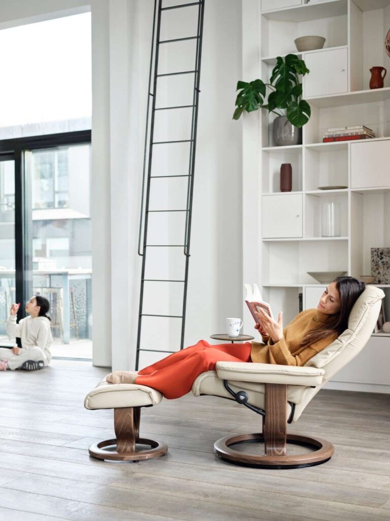 Dine meditatively. In addition to living room and office chairs, Stressless® offers ergonomic dining chairs – like the Mint and Laurel – that offer superior back support and seats that lightly recline, letting you lean back to fully savor your meal. When shopping for dining chairs, you may also want to pay attention to features that would make a chair support a straight posture for meditation. A firm yet comfortable seat, a low and straight back, and a profile lower to the floor – as seen in models like the Flex or Hype – can make it easy to repurpose a chair for meditation.