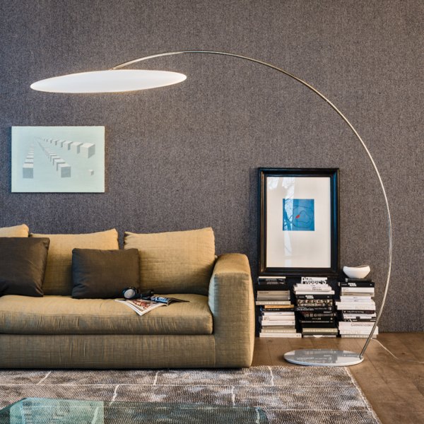 If you don’t think a chandelier or pendant is right for your space, but you still want a source of overhead illumination, consider an arc-style floor lamp. Compared to a typical floor lamp, arc lights have a curved design for a dramatic look, and a tall height that can mimic the effect of a chandelier or pendant.