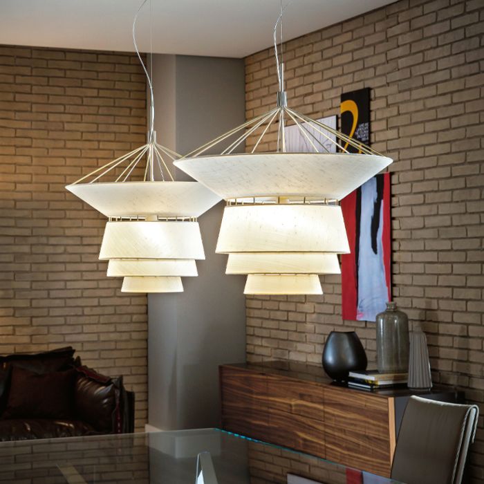 While these iconic crystal chandeliers emanate a shimmering, jewel-like light, modern pendants can give off a light that is more muted and even, though just as bright. One example is the Bolero Pendant, which Soto says, “will add an interesting focus to any area with its bold geometric lines.” This industrial-inspired pendant has a series of nested ivory shades that evoke modern architecture while softening the light within.