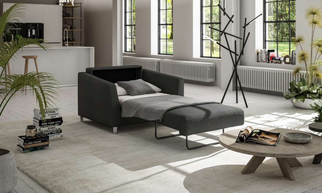 For your mattress choice, rather than going too plush or firm, opt for one in the middle of the firmness range to accommodate a greater variety of guests; the Montreal mattress features five layers of hybrid latex and memory foam as well as high-density foam, providing dreamlike comfort in the sweet spot between semi-firm and plush. “If your guest room is a multi-purpose room or on the smaller side, I’d recommend a sleeper sofa over a traditional bedroom set,” Erickson says. “Luckily, Copenhagen offers some great looking designs like Monika, which comes in a full or queen size, that can be opened into a bed quickly.” Sleeper sofas also give your guests extra flexibility and freedom to customize their space. For the most compact sleeping solution, consider the Monika chair sleeper, perfect for a single guest or placed alongside a bed or larger sleeper.