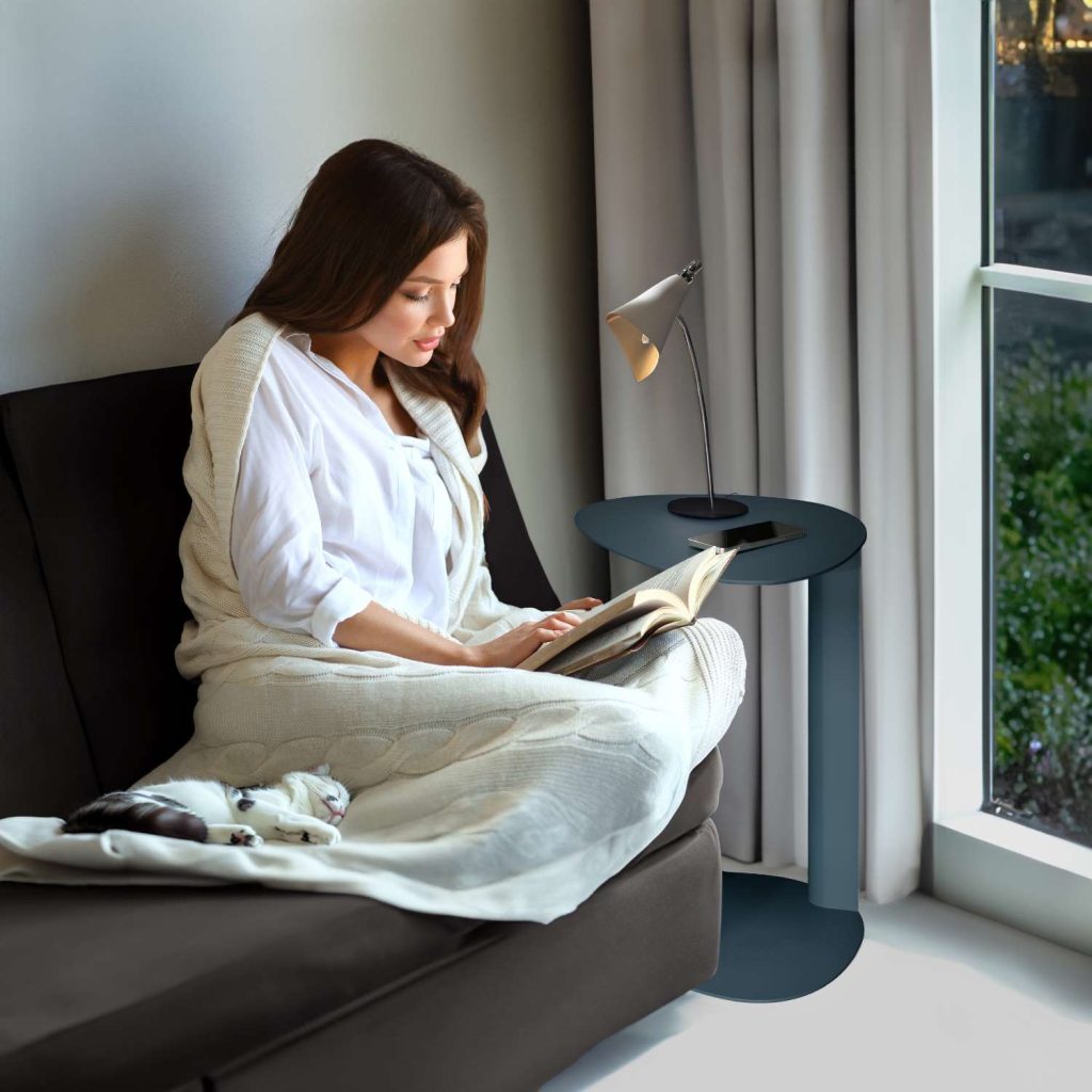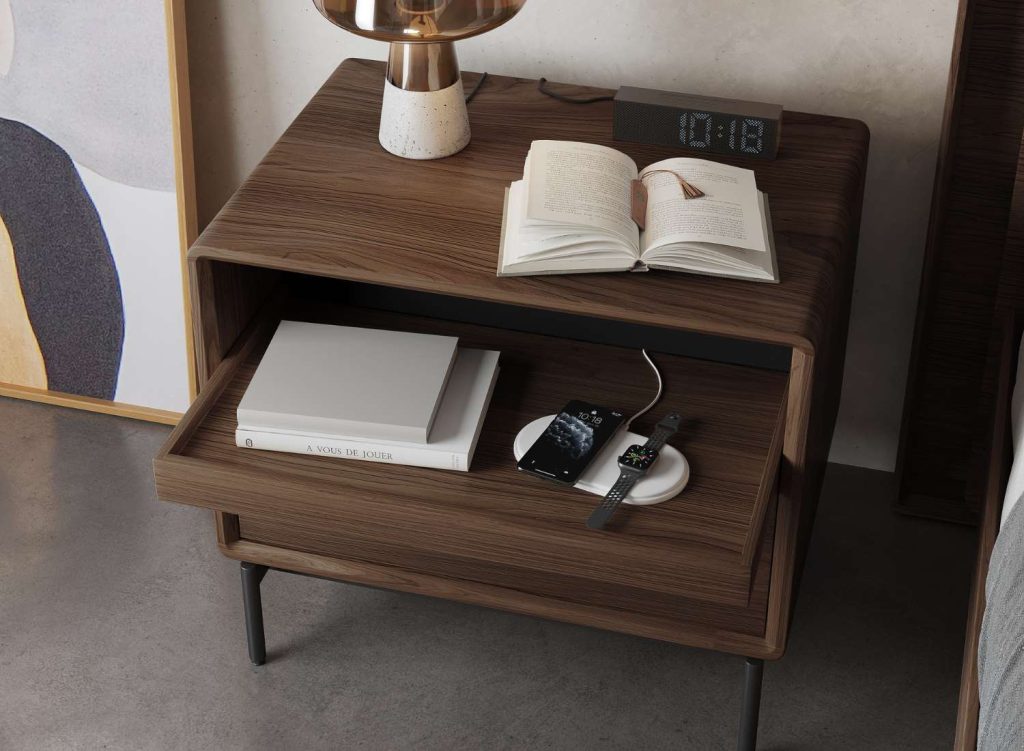 Whatever your guests’ activities are, they’re sure to long for a restful respite, both at the end of the day and in between activities. Lay the foundation for a relaxing stay with key furnishings that are designed with universal comfort in mind. A high-quality bed frame and mattress or sleeper sofa can make all the difference to someone’s sleep quality – allowing them to rest easily each night and feel refreshed each morning. Consider an upholstered frame in a deep, moody color for a cocooned feel or a warm wood piece that exudes classic comfort. A mid-century modern design like Prescott offers the best of both worlds, with a solid walnut veneer and grey fabric headboard. “If space is tight, try a smaller-scale bedroom set like Bravo,” Erickson suggests, which is available in a variety of frame sizes. “Even if you can’t fit the matching nightstands, it’s nice to have somewhere for your guests to set down a glass of water or other items. Both the Scoop accent table by Elite Modern and the BDI Bink table are good, smaller alternatives.”