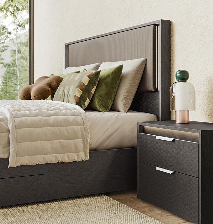 Another way to design with touch is through textured furniture and accessories. Consider placing a cable-knit blanket on an armchair to create a cozy reading spot, or a soft pillow like the Lifestyle Velvet Finger Pillow on your sofa for a touch of fun. You may also enjoy furnishings that employ a mix of textures, such as the Ashby Coffee Table (with wood, glass, and ridged lacquer) or the Bellezza Bed (with eco-leather and Tetris-textured oak).