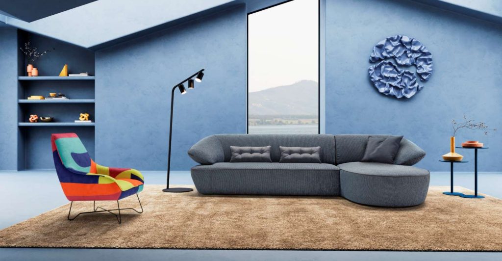 “I recommend more vibrant color for areas where people gather and converse – it creates an energizing feel,” says Joffroy. Take, for instance, the rich red leather of the Aldo Chair, the fun pattern of the Namy Chair, or the blue fabric of the Lake Sofa, whose slatted back adds extra visual interest. Artwork and decor are another great way to catch the eye, whether it’s a bold painting like Aqueduct or a minimalist work like Pair of Horses.
