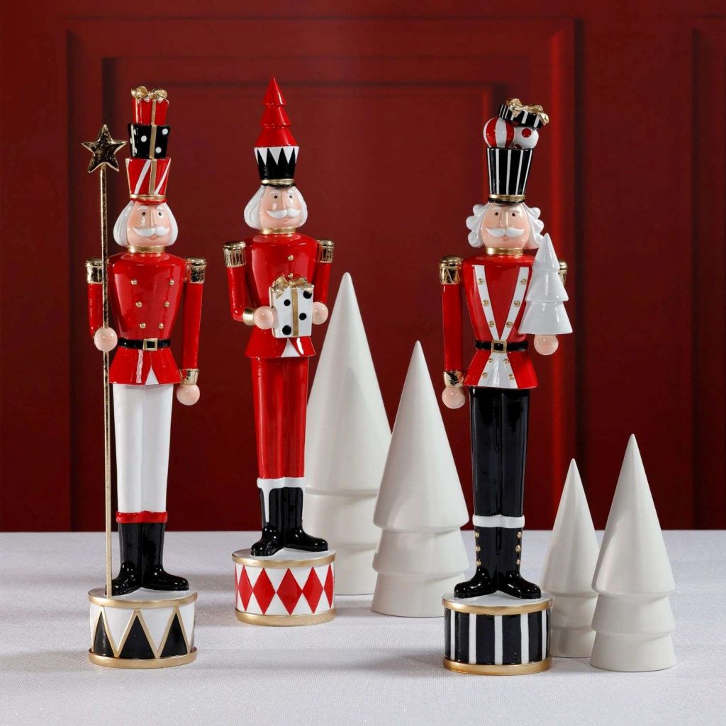 For example, the Twinkle Troop figurines are a great centerpiece for a more traditional tablescape. “This set of three nutcrackers in shiny red brings in an updated bit of old-world elegance,” says Milk. They pair well with the Pearl White Deer, whose lustrous finish adds a touch of sophistication. If a minimalist tablescape is more your style, consider a couple of Snowman Figurines paired with the simplified silhouettes of the White Christmas Tree and Narrow White Tree for a look that is low-key yet artful.