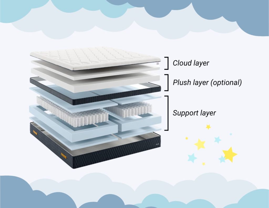 Each Sky mattress is composed of three basic components: the cover, the foam, and the coils, which are then arranged in layers. The Cloud layer is the uppermost layer, consisting of a breathable cover stitched over in-house developed NordicSoft™ foam. The optional middle layer is the Plush layer composed of additional NordicSoft™ foam, which gives the mattress a luxurious feel for those who love an extra-soft sleeping surface. Finally, the Support layer on the bottom contains AdaptiveZones™ pocket coils that are specially placed to give just the right amount of support to different areas of your body.