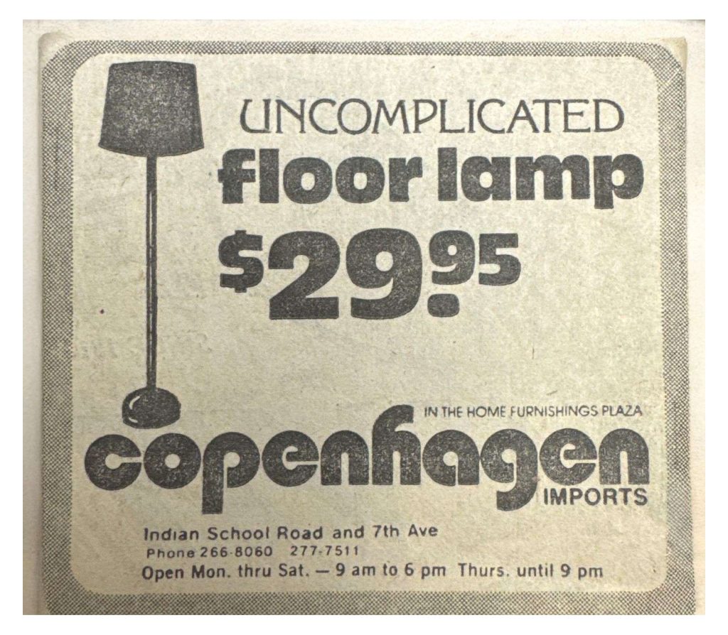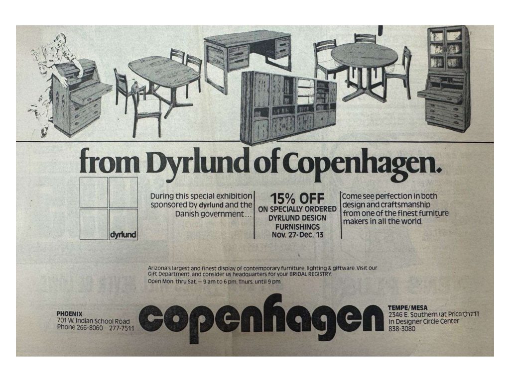 On December 8, 1969, Copenhagen was incorporated, and a few months later, on March 1, 1970, the first store opened. Behind the doors of this modest showroom at 709 W. Indian School Rd, one could find a variety of modern Scandinavian furnishings overseen by a small yet dedicated staff consisting of Erik, Lise, Tony, and Jonna (Tony’s wife).