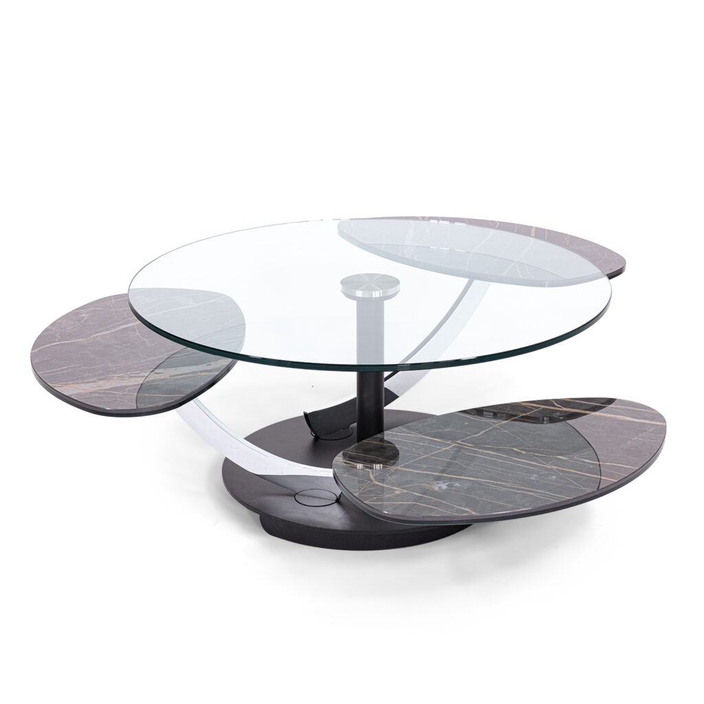 The Petres Cocktail Table, by NAOS of Italy, will be the highlight of your living space, with a glass tabletop and three black desire keramik marble lower tops in varying...