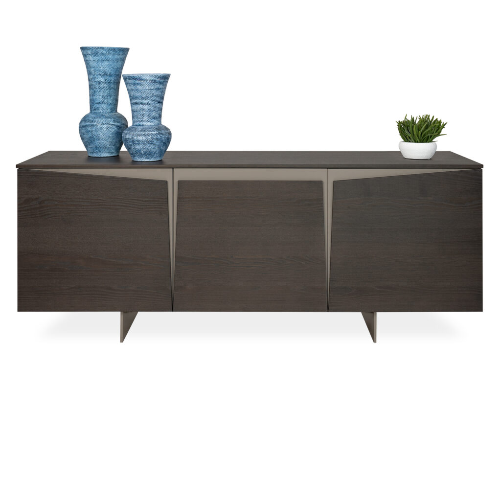 The Voyager Sideboard is a marvel of contemporary design, featuring matte graphite wood cabinets and stunning doors in frosted bronze glass with glossy black studs that stand out in relief....