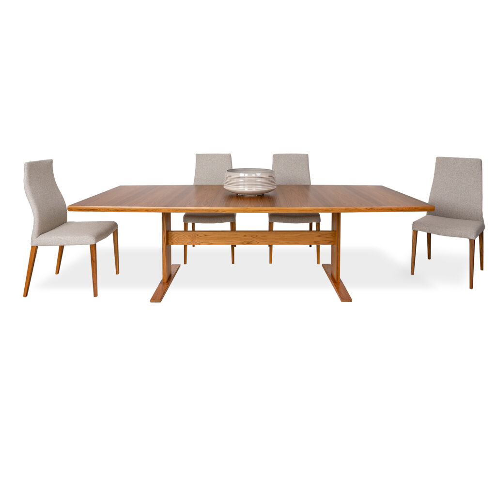 Crafted from wood with a teak finish, the Heidi Elliptic Table has a clean, no-fuss look and a unique barrel-shaped tabletop. Heidi features a classic trestle base with two legs...