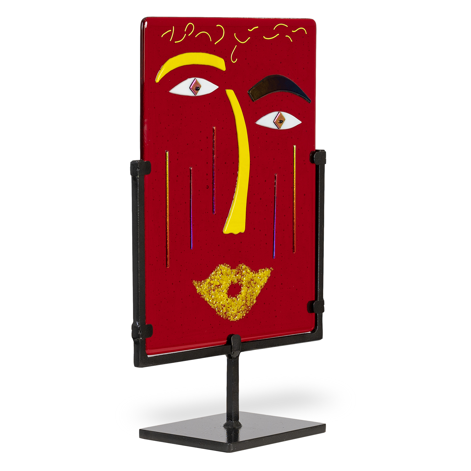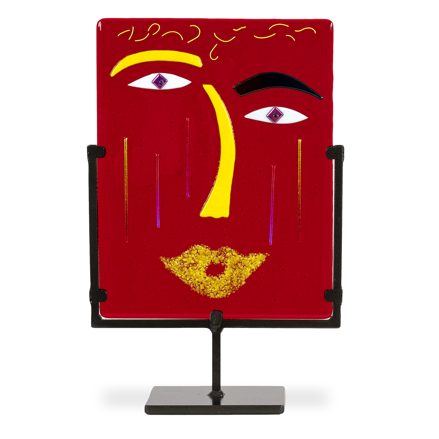 [0] => The 3D Glass Face sports a playful blend of colors, textures, and shapes on a rectangular slab of deep red glass. Made by Arizona glass artisans Carole Perry and Don Carroll, this sculpture features diamond-shaped eyes, an elongated nose, textured lips and hair, and iridescent accents on the cheeks. Included with a steel display stand, the 3D Glass Face will imbue any environment with a whimsical and lighthearted mood.