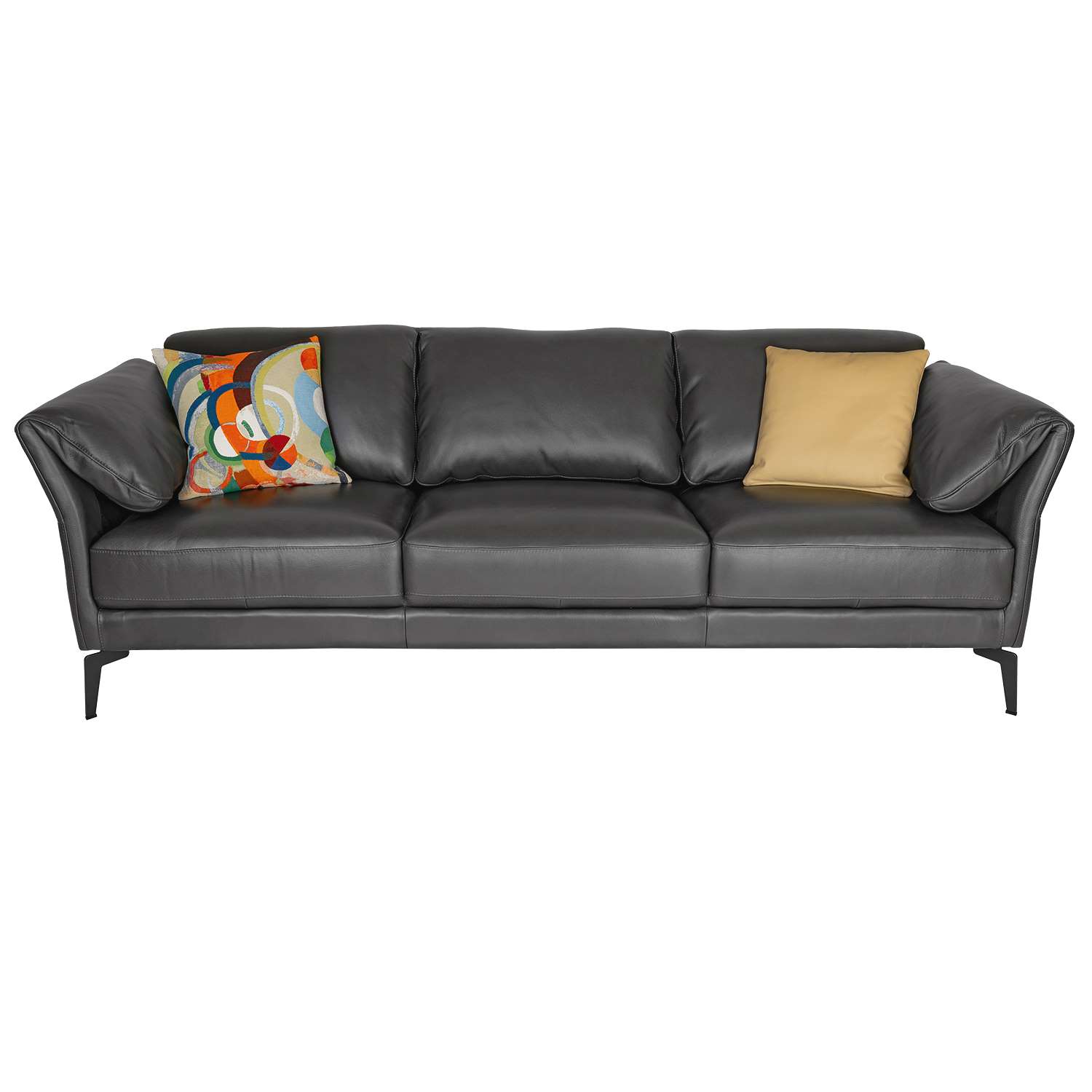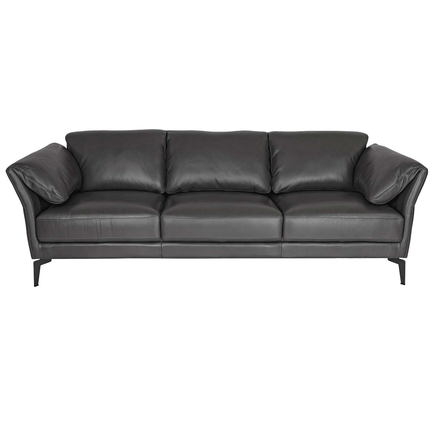 The Aalborg Sofa has a timeless design and luxurious look, with soft, top-grain Iron leather upholstery. Aalborg's unique arms taper outward slightly then fold over against the seats, creating a comfortable support that can be fluffed easily. French mattress stitching adds a tailored look and sleek, contemporary black metal legs complement the deep grey leather.