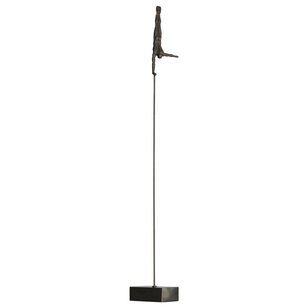 The Acrobat on One Arm sculpture demonstrates strength and grace, with a gravity-defying pose and a narrow, minimalist supporting pole and base. The metallic finish is industrial yet chic, and highlights the figure's athletic pose. This statue will be an eye-catching contemporary addition to your home or office space.